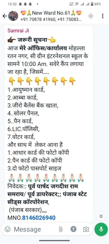 भाजपा नेताओं का कहना है कि जगदीश समराय व्हाट्सअप ग्रुपों में लोगों को मेसेज भेज कर बता रहे हैं कि वह मुहल्ला रत्न नगर सी ग्रीन स्कूल के सामने सुबह 10 बजे एक कैंप का आयोजन करने जा रहे हैं जिससे आयुष्मान कार्ड, जीरो बेलेंस बैंक खाता, वोटर कार्ड, आधार कार्ड एलआइसी पोलिसी,आभा कार्ड, सोलर पैनल के कार्ड बनाए जाएंगे। कार्ड बनवाने के लिए जरुरी दस्तावेज आधार कार्ड,पैन कार्ड तथा दो पासपोर्ट साइज फोटो ले कर आए।